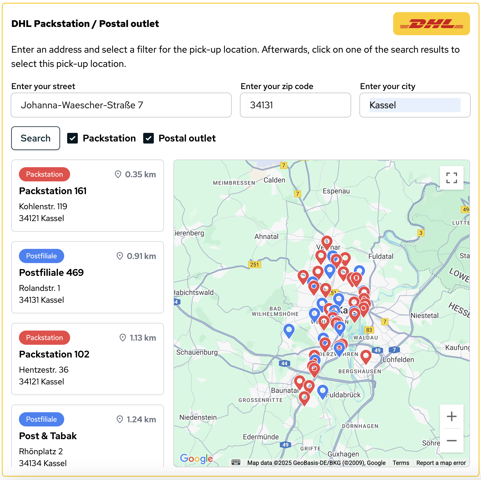 Convenient Pickup selection: Customers can easily locate nearby DHL Packstations or stores for flexible package pickup, especially helpful for people who aren’t home during delivery hours.
