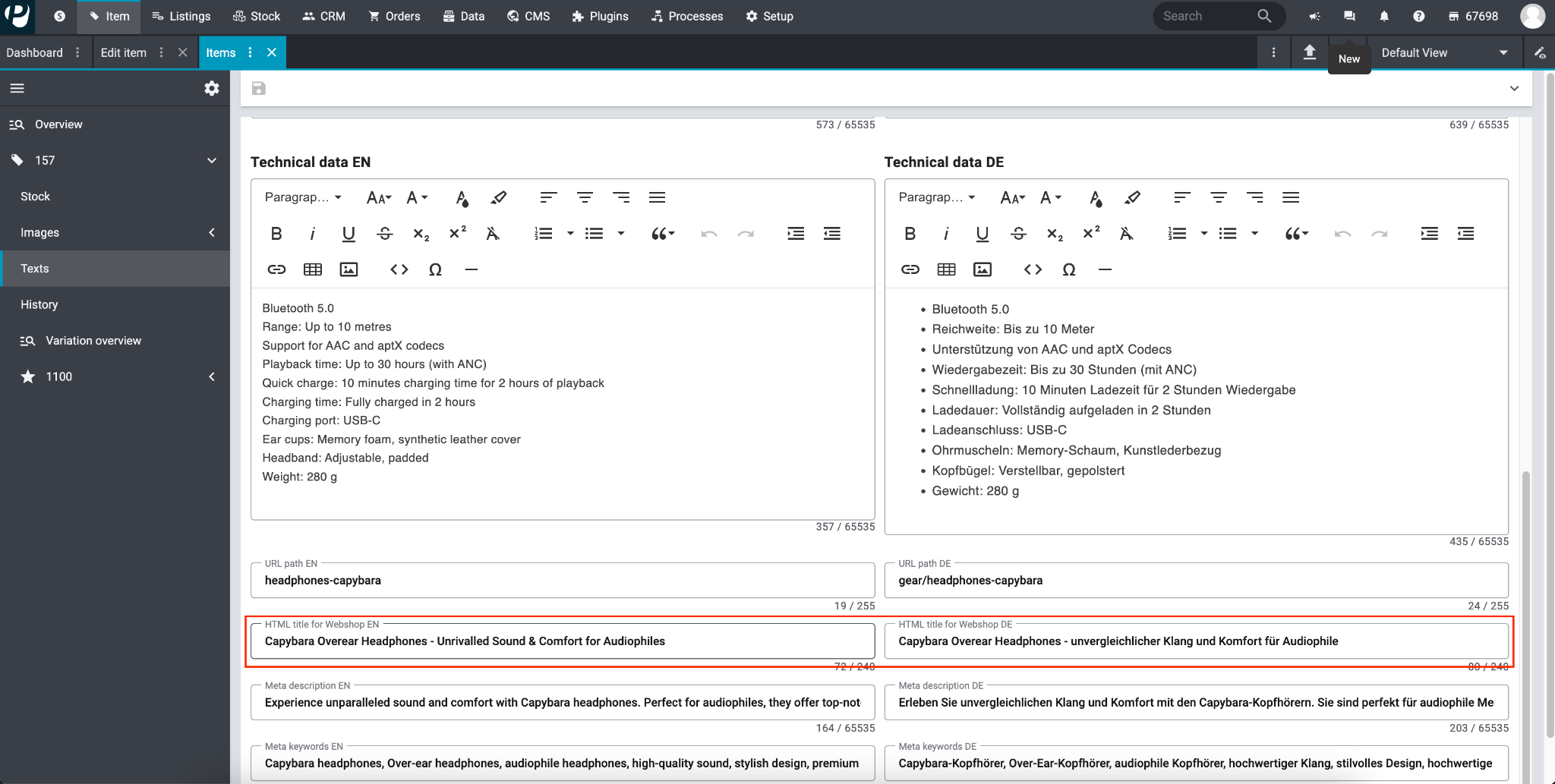 We are pleased to inform you that you can now customize the HTML title of an item. Previously, this title was automatically generated according to a fixed format. With this change, you have more control over the display and discoverability of your items in plentyShop LTS and PlentyONE Shop (previously plentyShop PWA)